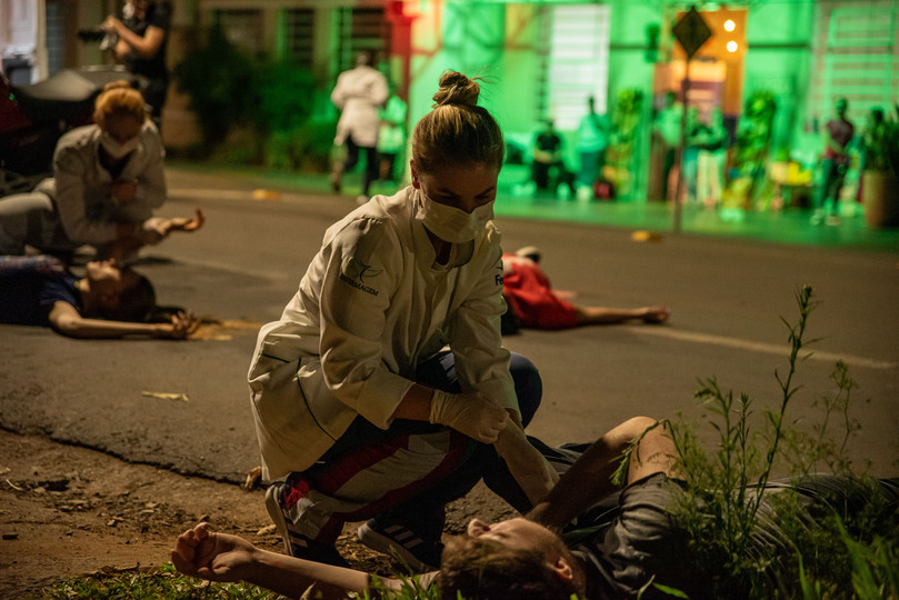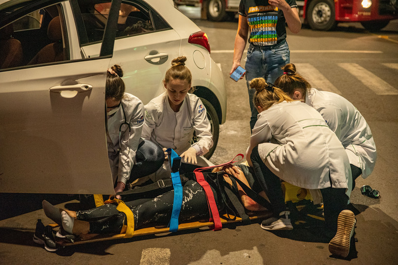 A atividade reproduziu 3 diferentes cenários de emergência: colisão entre carro e poste de luz energizado, colisão envolvendo carro, moto e pedestre e evento climático com vítimas. Em cada etapa, os acadêmicos foram desafiados a aplicar técnicas de Atendimento Pré-Hospitalar, tomando decisões rápidas e seguras diante de cenários complexos e simultâneos.